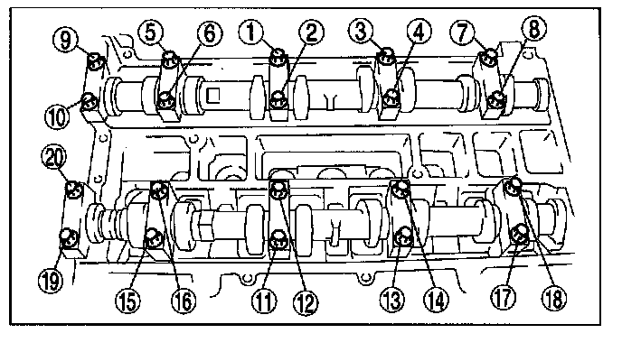 Tighten the camshaft cap bolts in the order shown with the following two steps.