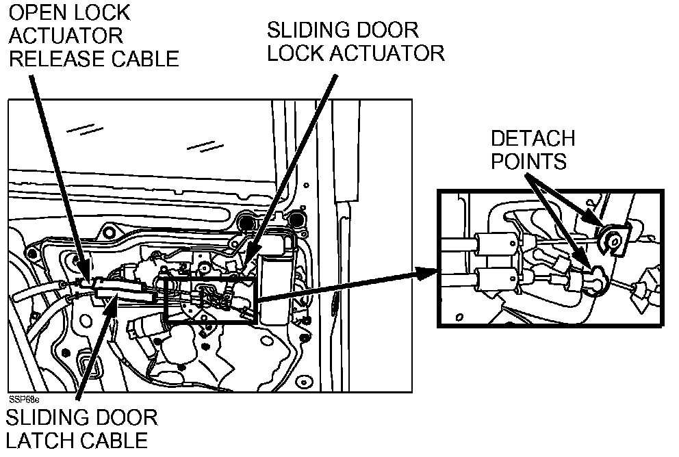 13. Detach the sliding door latch cable end and open lock actuator cable end from the sliding door lock actuator.