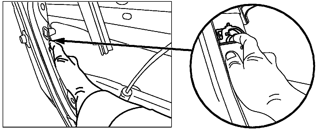 21. While inside the vehicle, pull on the open lock actuator release cable to move the door so it is between 4 to 6 inches from being latched, but do not latch to the closed position.