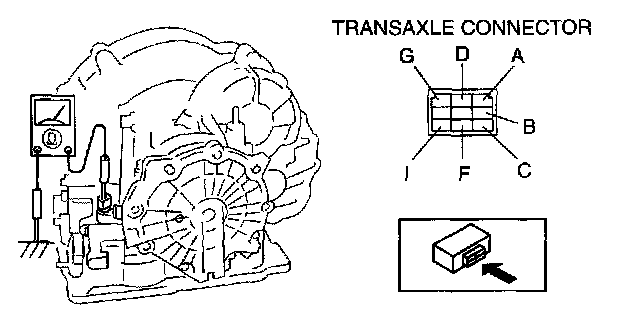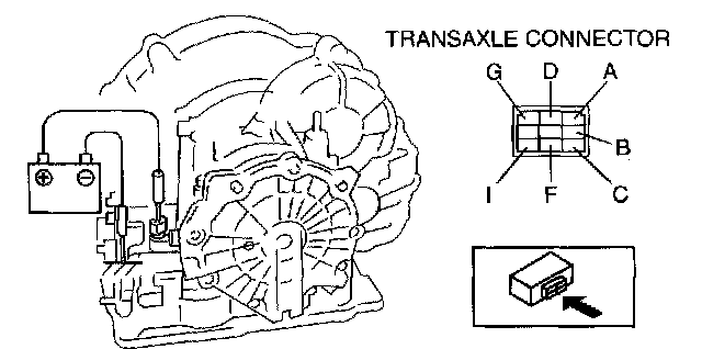 2. Apply battery positive voltage to the transaxle connector terminals A, B, C, F or G and battery negative voltage to GND, and verify that operating sound is heard from the solenoid.