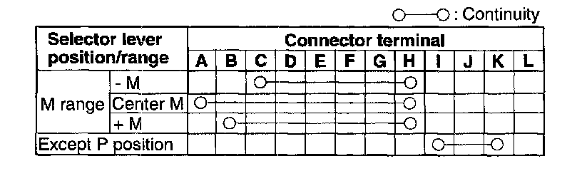 5. Verify that the continuity is as indicated in the table. If there is any malfunction, replace the selector lever component.