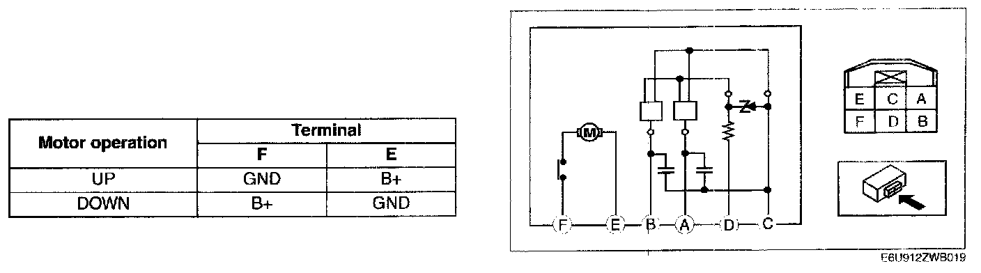 2. Apply battery positive voltage to the power window motor terminals E and F and inspect the operation the power window motor operation.