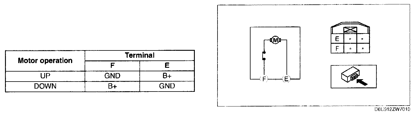 1. Apply battery positive voltage to the power window motor terminals and inspect the power window motor operation.
