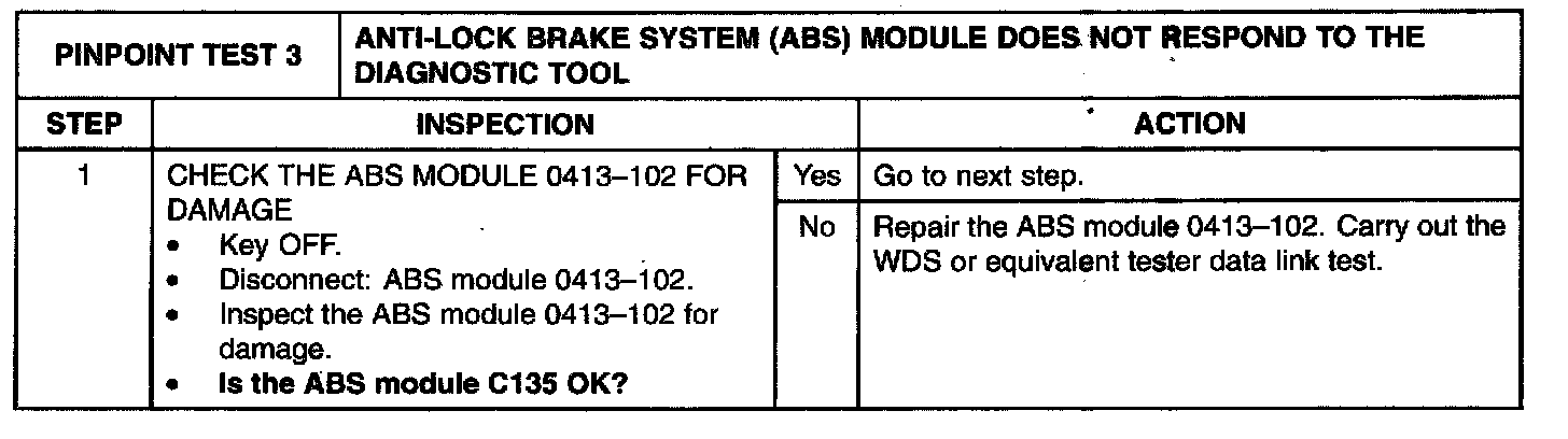 PINPOINT TEST 3: ANTI-LOCK BRAKE SYSTEM (ABS) MODULE DOES NOT RESPOND TO THE DIAGNOSTIC TOOLNormal Operation