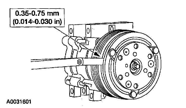 5. Measure and adjust the clutch air gap by removing or adding A/C clutch hub spacers.