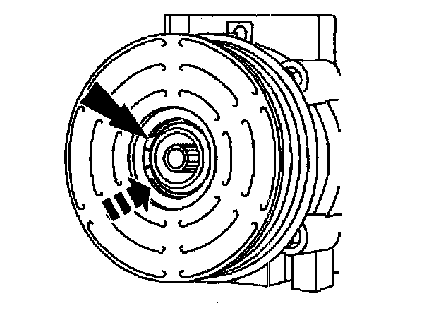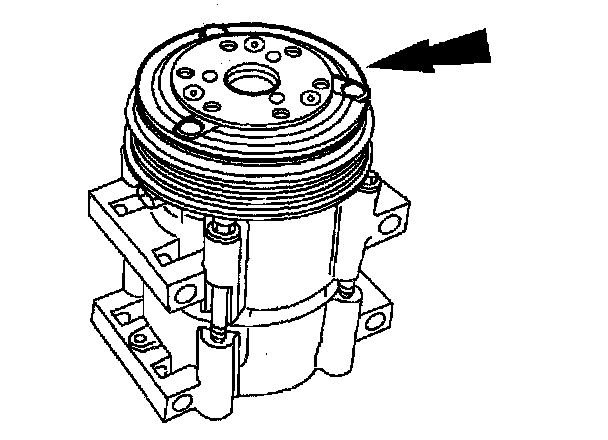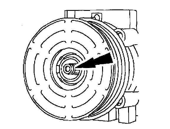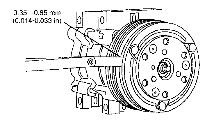 8. Measure and adjust the clutch air gap by removing or adding A/C clutch hub spacers. See A/C COMPRESSOR MAGNETIC CLUTCH ADJUSTMENT.