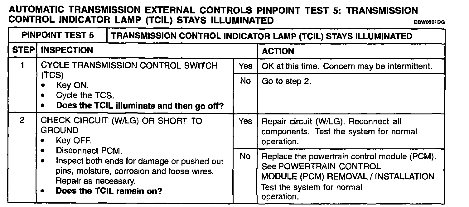 AUTOMATIC TRANSMISSION EXTERNAL CONTROLS PINPOINT TEST 5: TRANSMISSION CONTROL INDICATOR LAMP (TCIL) STAYS ILLUMINATED