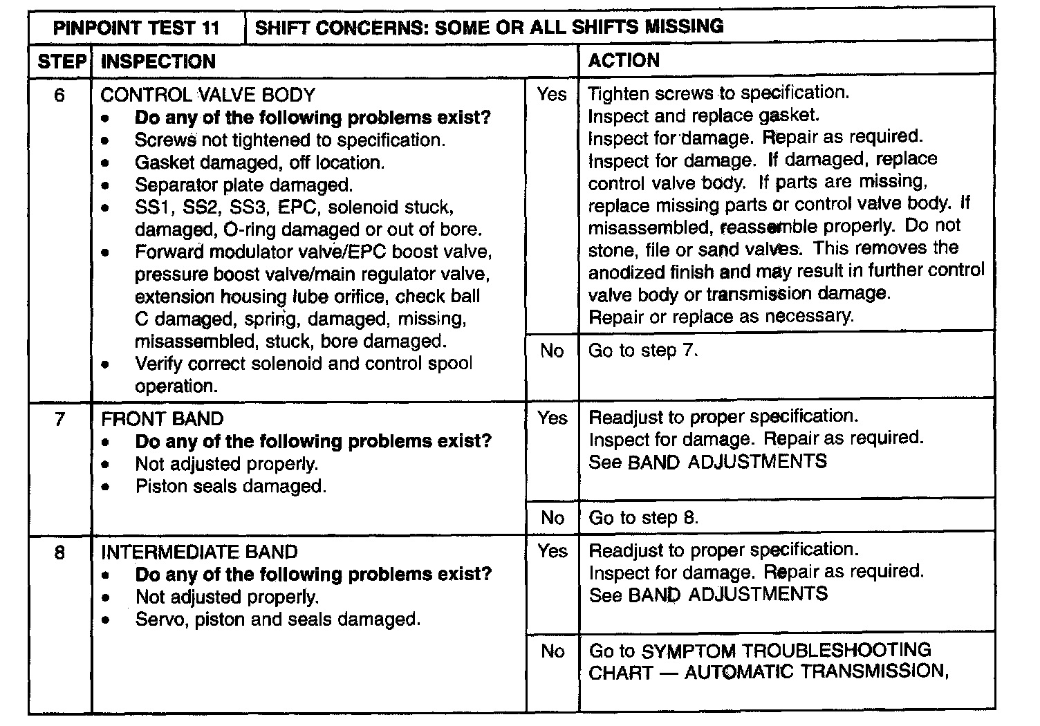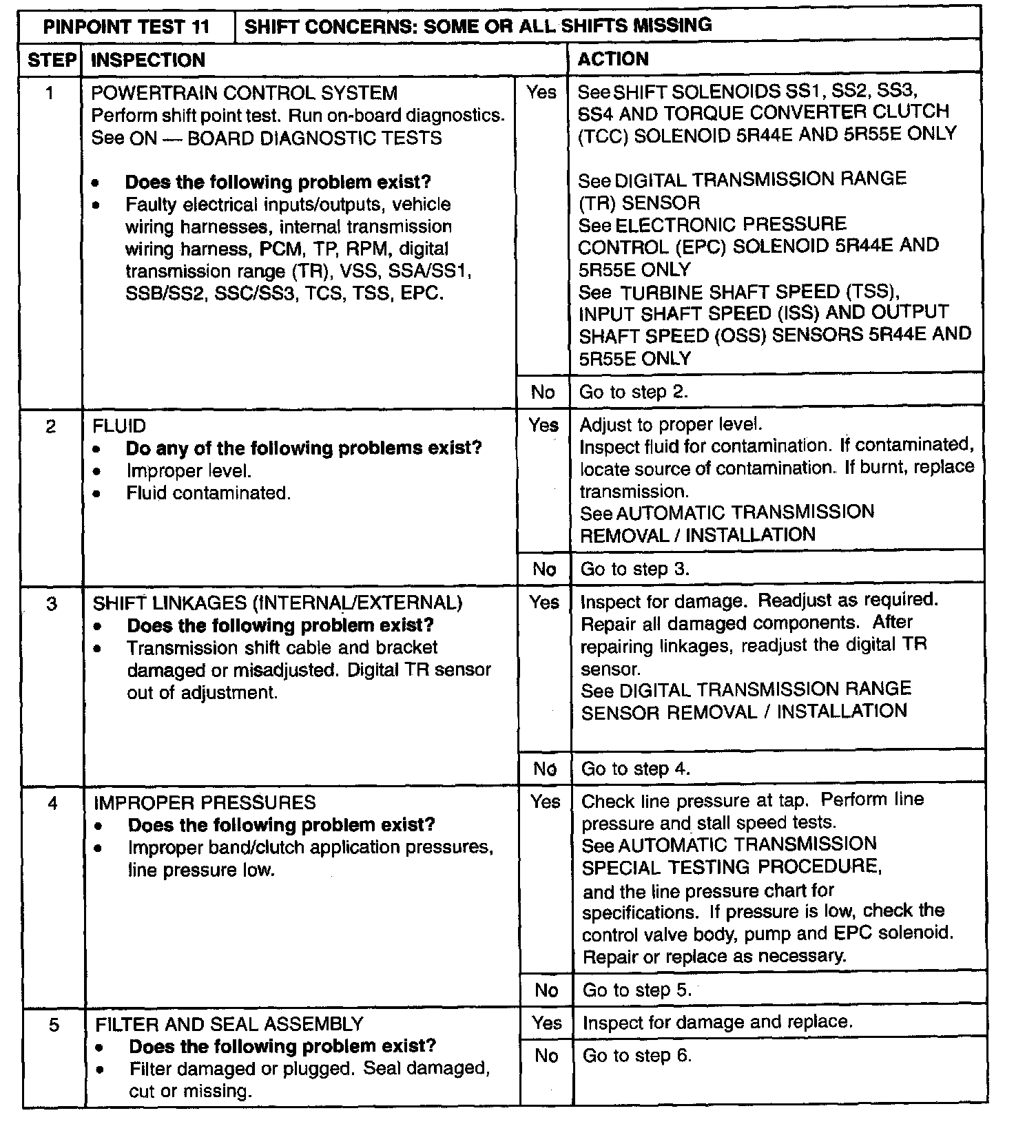 AUTOMATIC TRANSMISSION PINPOINT TEST 11: SHIFT CONCERNS: SOME OR ALL SHIFTS MISSINGNote: To diagnose specific no shift concerns, see the appropriate shift test.