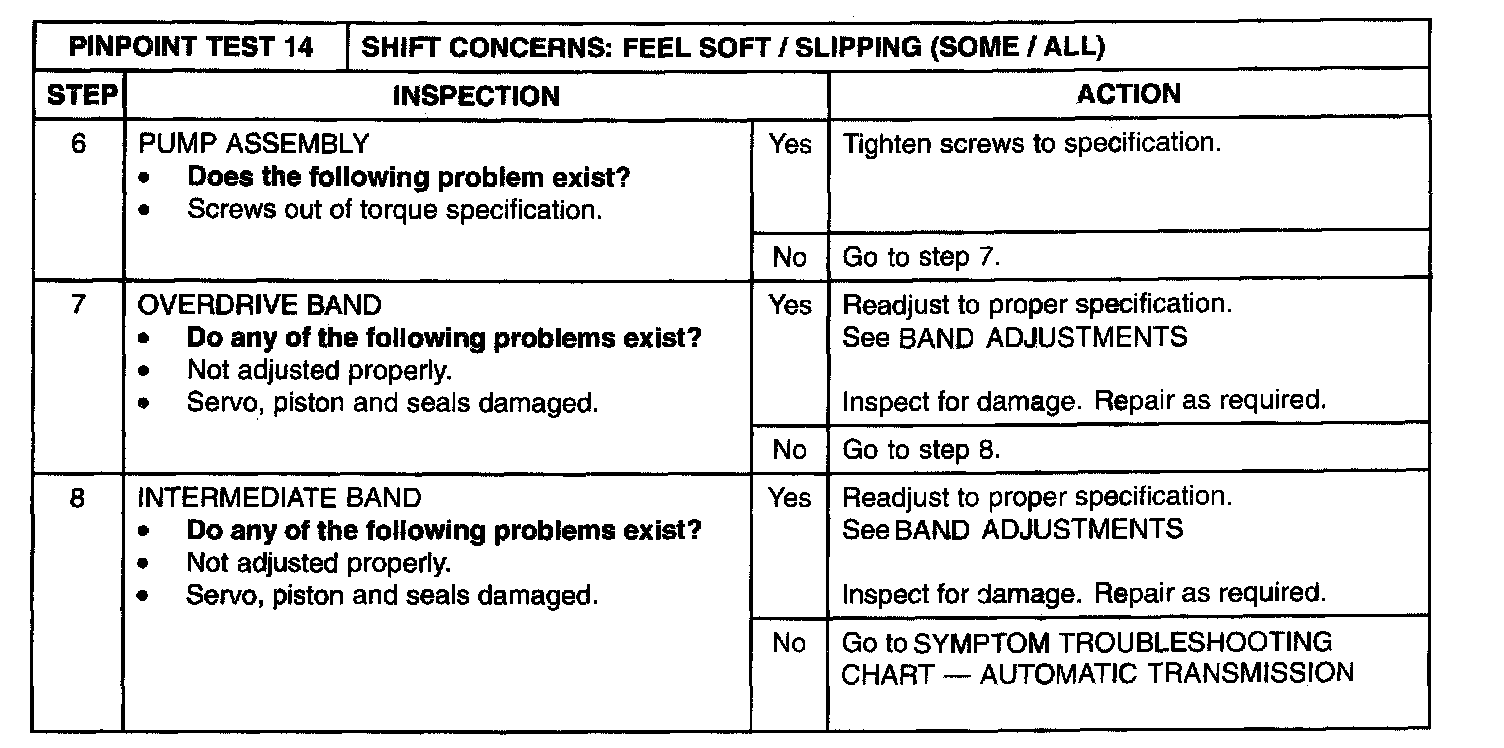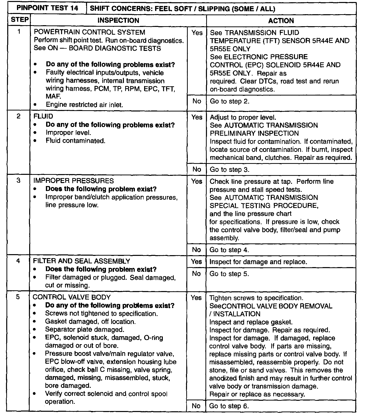 AUTOMATIC TRANSMISSION PINPOINT TEST 14: SHIFT CONCERNS: FEEL SOFT / SLIPPING (SOME / ALL)Note: To diagnose a specific shift concern, see the appropriate shift test.