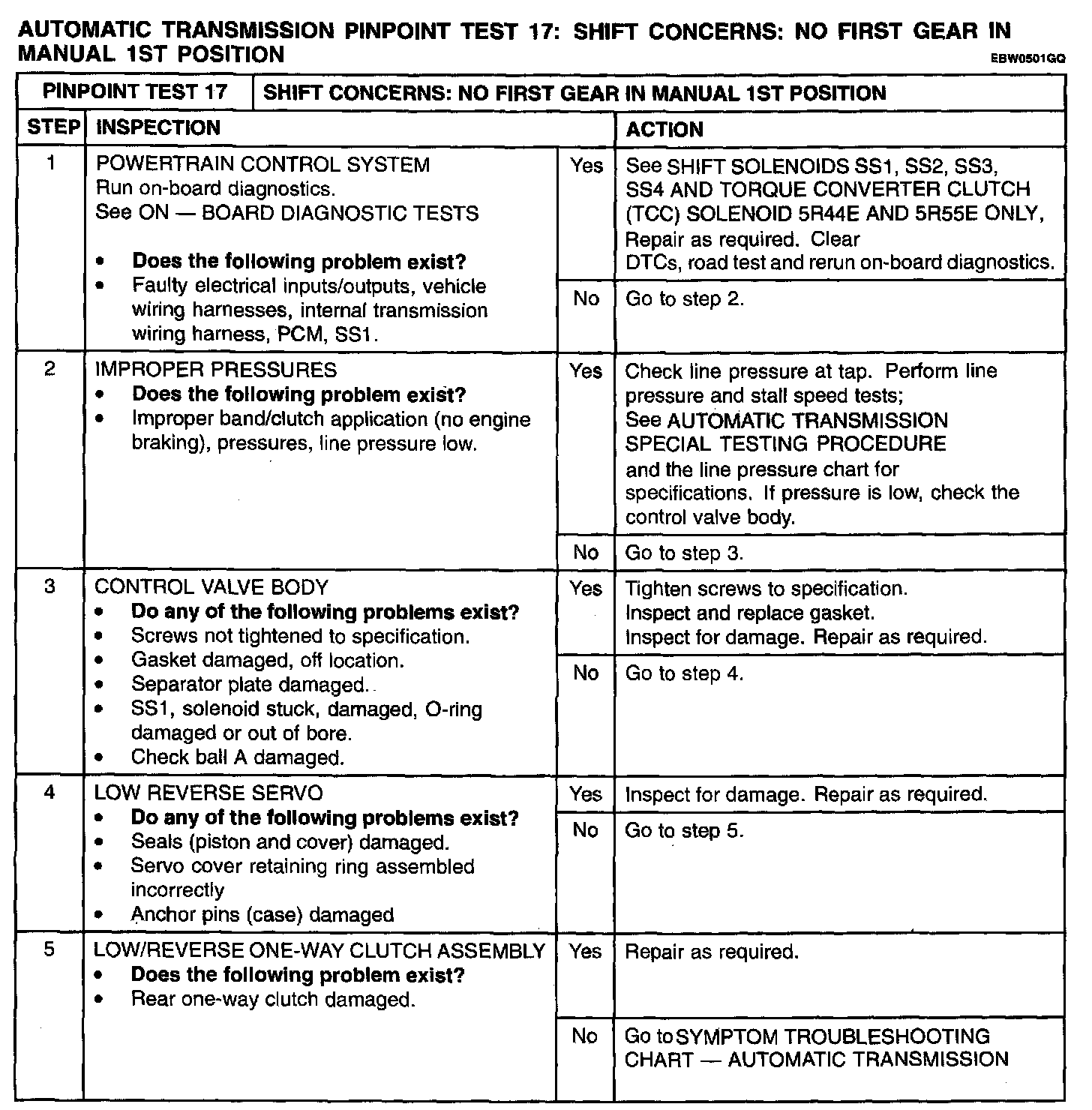 AUTOMATIC TRANSMISSION PINPOINT TEST 17: SHIFT CONCERNS: NO FIRST GEAR IN MANUAL 1ST POSITION