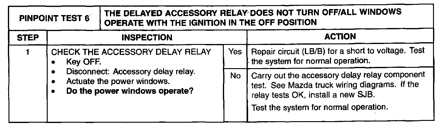 PINPOINT TEST 6: THE DELAYED ACCESSORY RELAY DOES NOT TURN OFF/ALL WINDOWS OPERATE WITH THE IGNITION IN THE OFF POSITIONNormal Operation