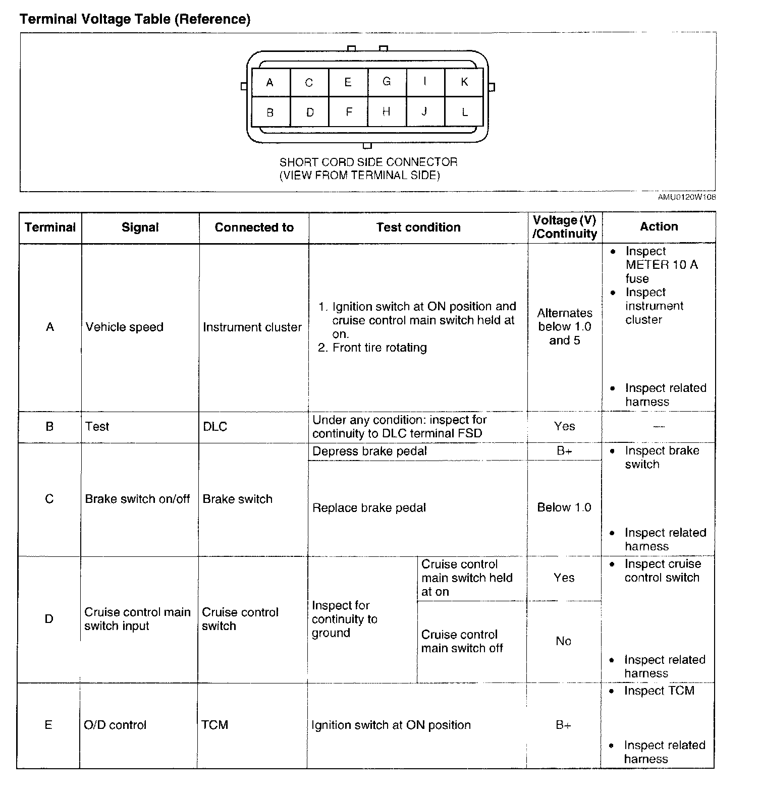 2. Measure the voltage, continuity and resistance at the cruise actuator terminals as indicated.