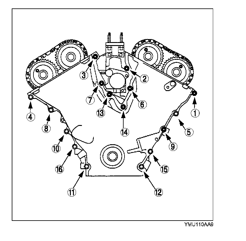 Remove the engine front cover bolts and studs in the order indicated in the figure.