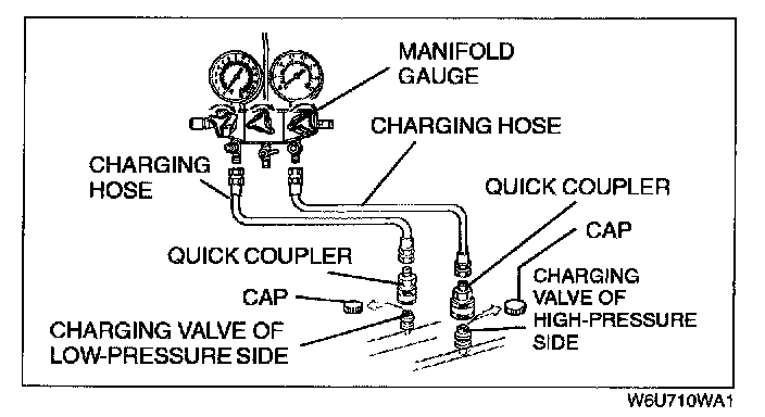 2. Connect the charging hoses to the high- and low-pressure side joints of the manifold gauge.