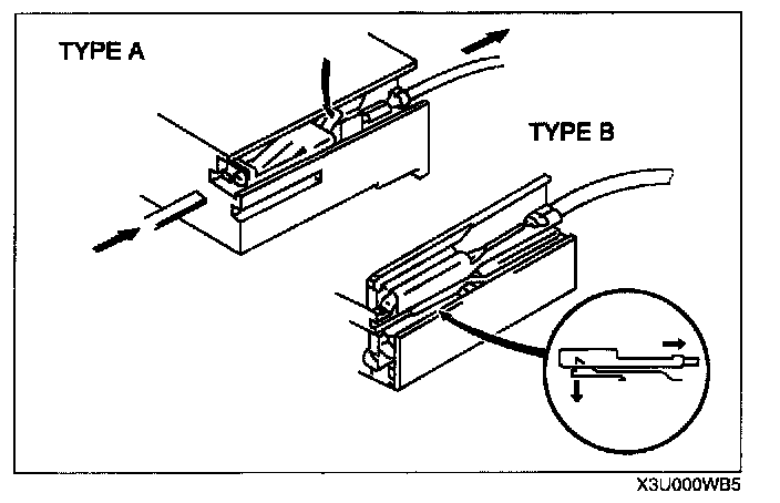 - Use the appropriate tools to remove a terminal as shown. When installing a terminal, be sure to insert it until it locks securely.