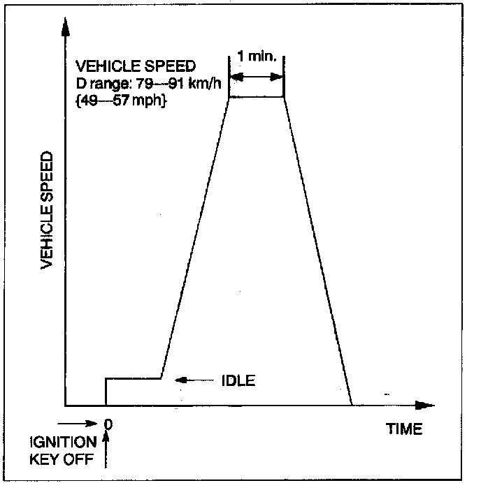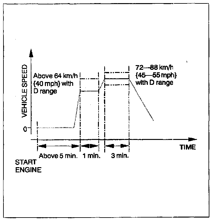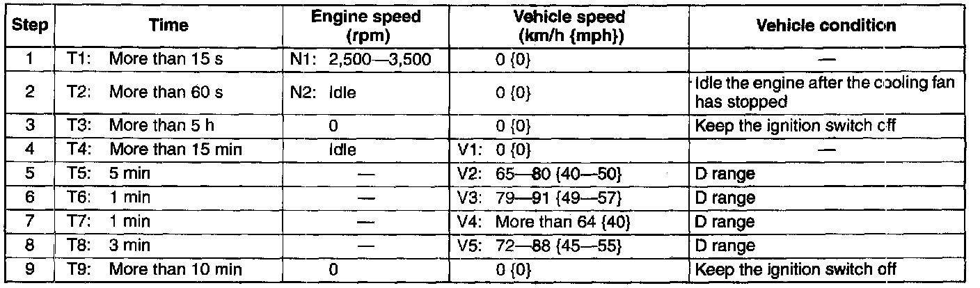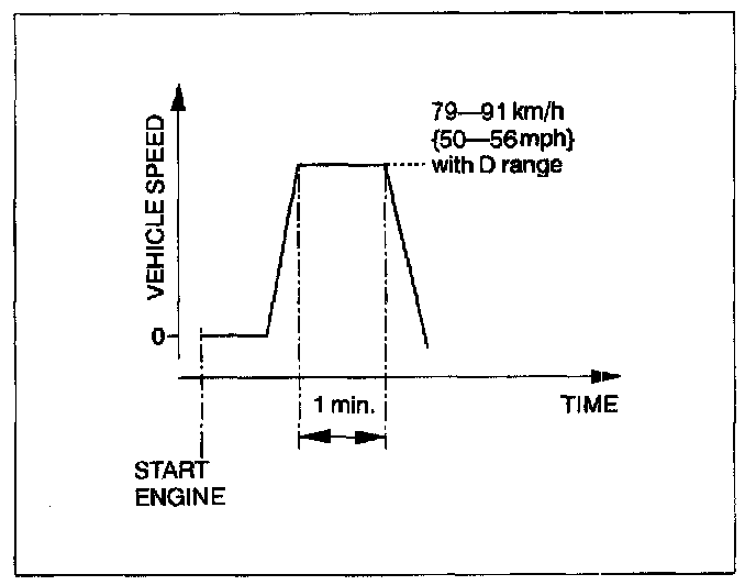 6. Drive the vehicle at the engine speed of 65-80 km/h {40-50 mph} for 5 min or more.