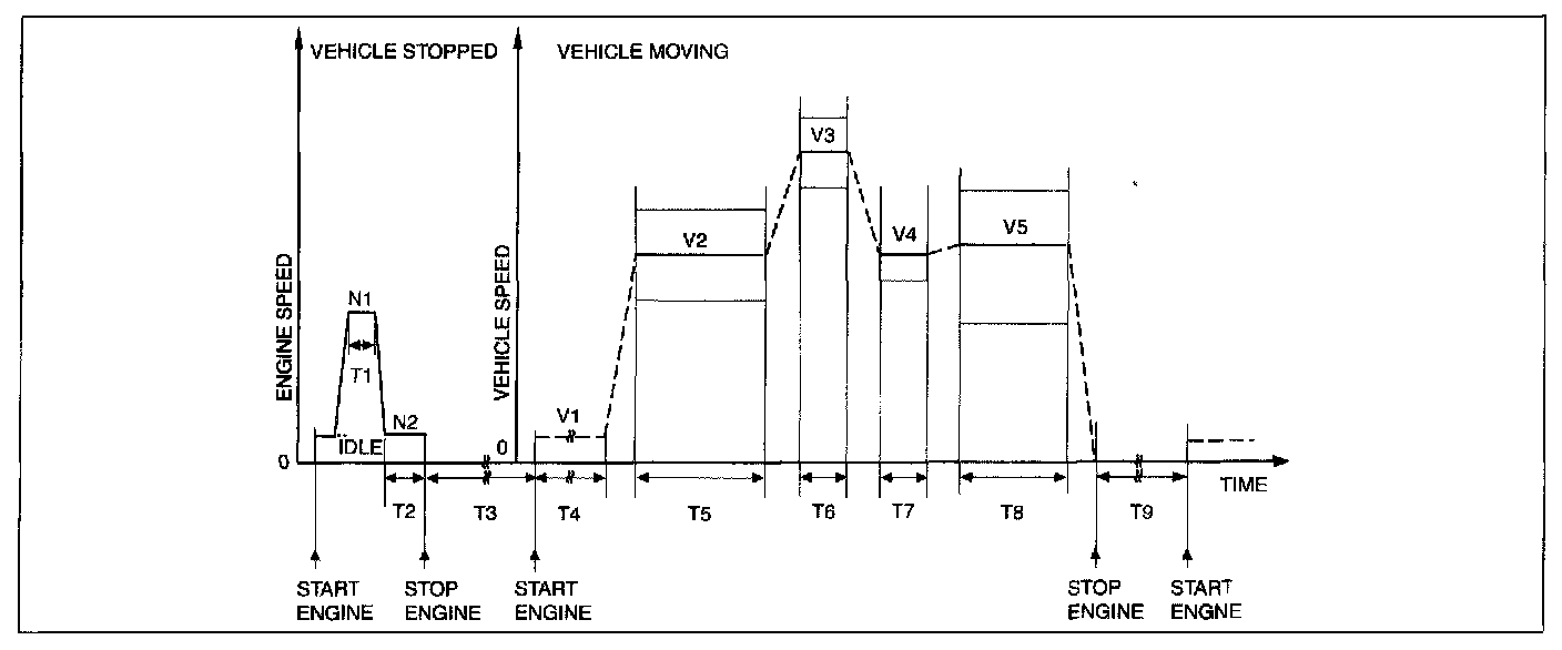 5. With the vehicle stopped, race the engine at the engine speed indicated, and then drive the vehicle as shown in the graph. The driving conditions before driving at constant speed are not specified. If possible, monitor RPM PID for engine speed during this procedure.