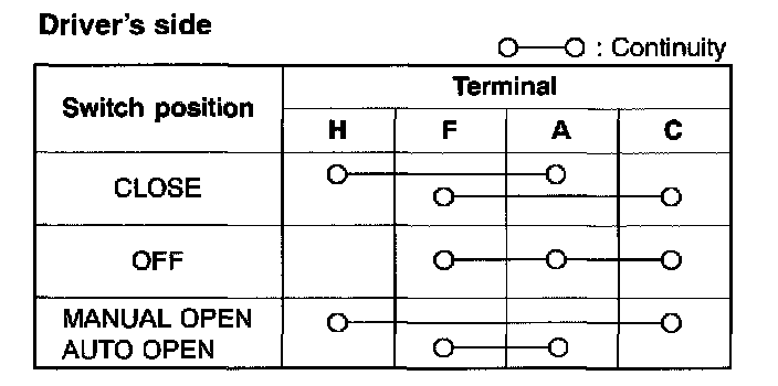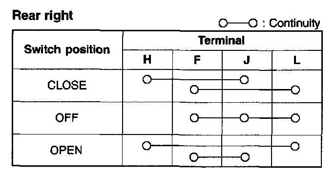 3. Inspect for continuity between the power window main switch terminals using an ohmmeter.