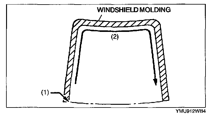 7. Install the front windshield molding in the direction shown by the arrow. (2)