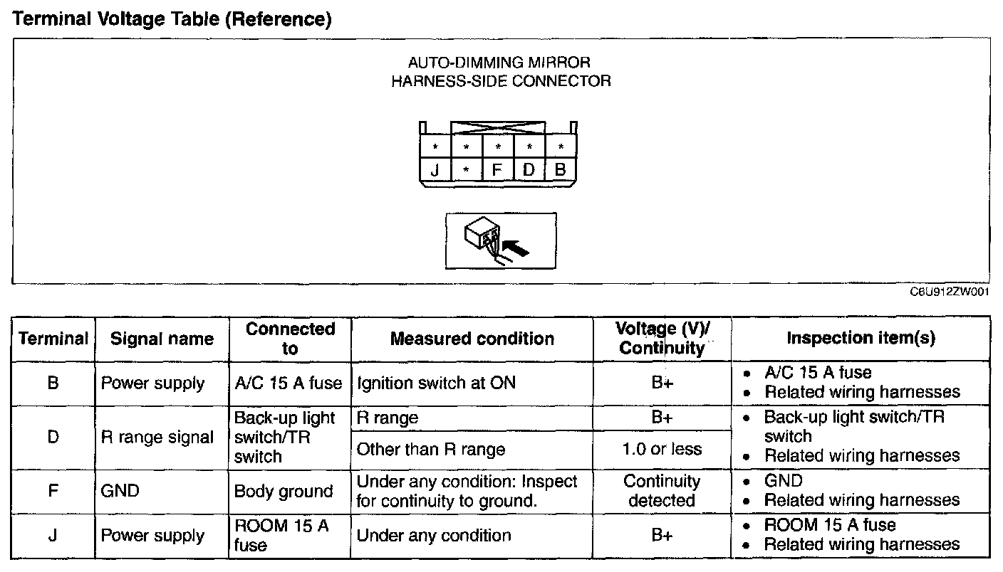 AUTO-DIMMING MIRROR INSPECTION1. Measure the voltage at each terminal (other than terminal F).