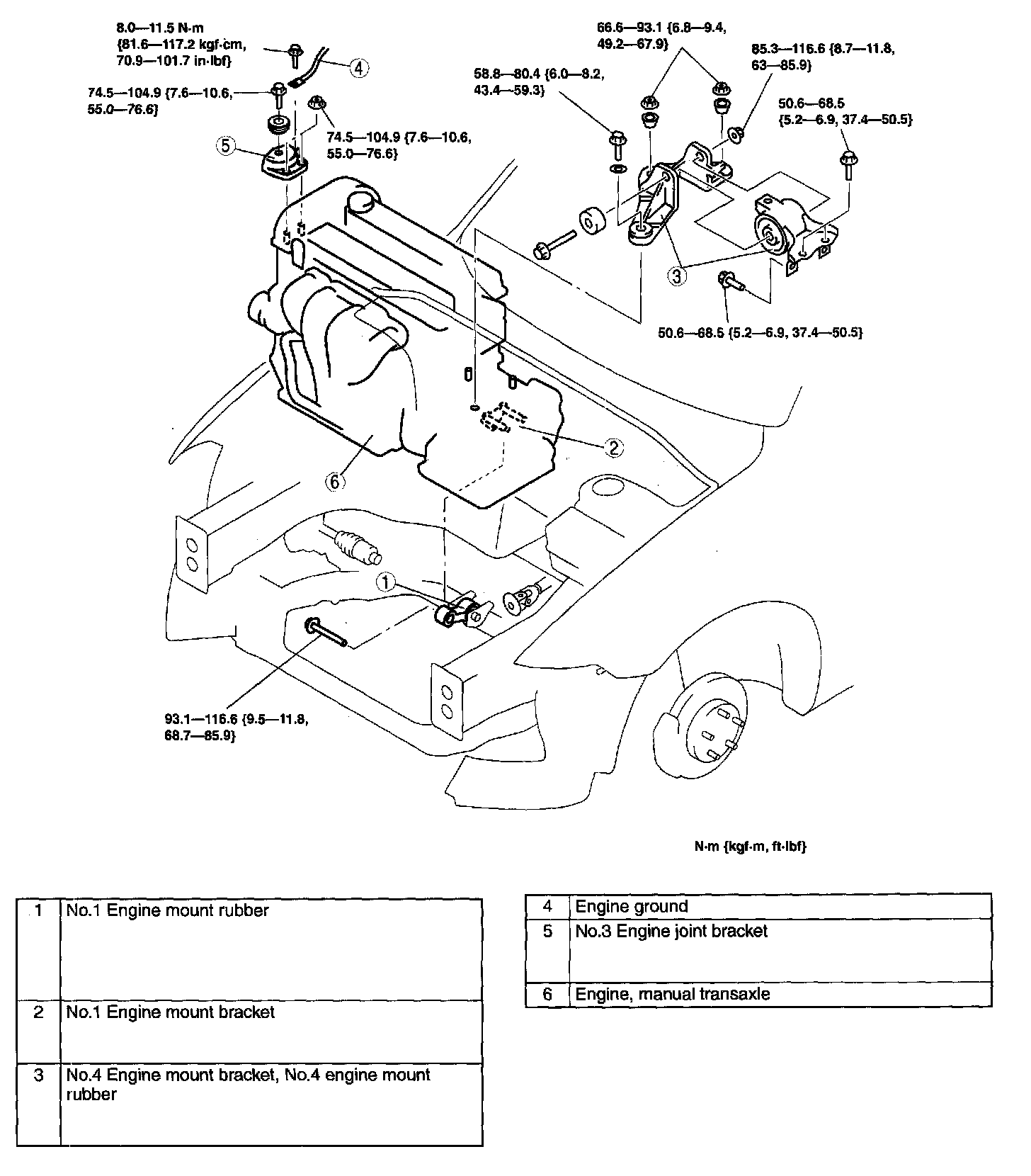 (4) 85.3 - 116.6 Nm (8.7 - 11.8 kgf-m, 63.0 - 85.9 ft. lbs.)