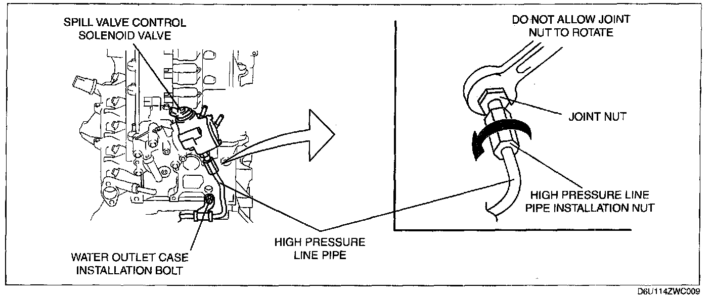 3. Tighten the high pressure line pipe installation nut using the following procedures.