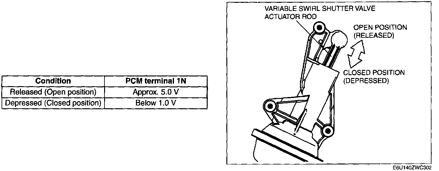 2. Verify that the PCM terminal 1 N voltage is as shown in the following table when the variable swirl shutter valve actuator rod is depressed and released by hand.
