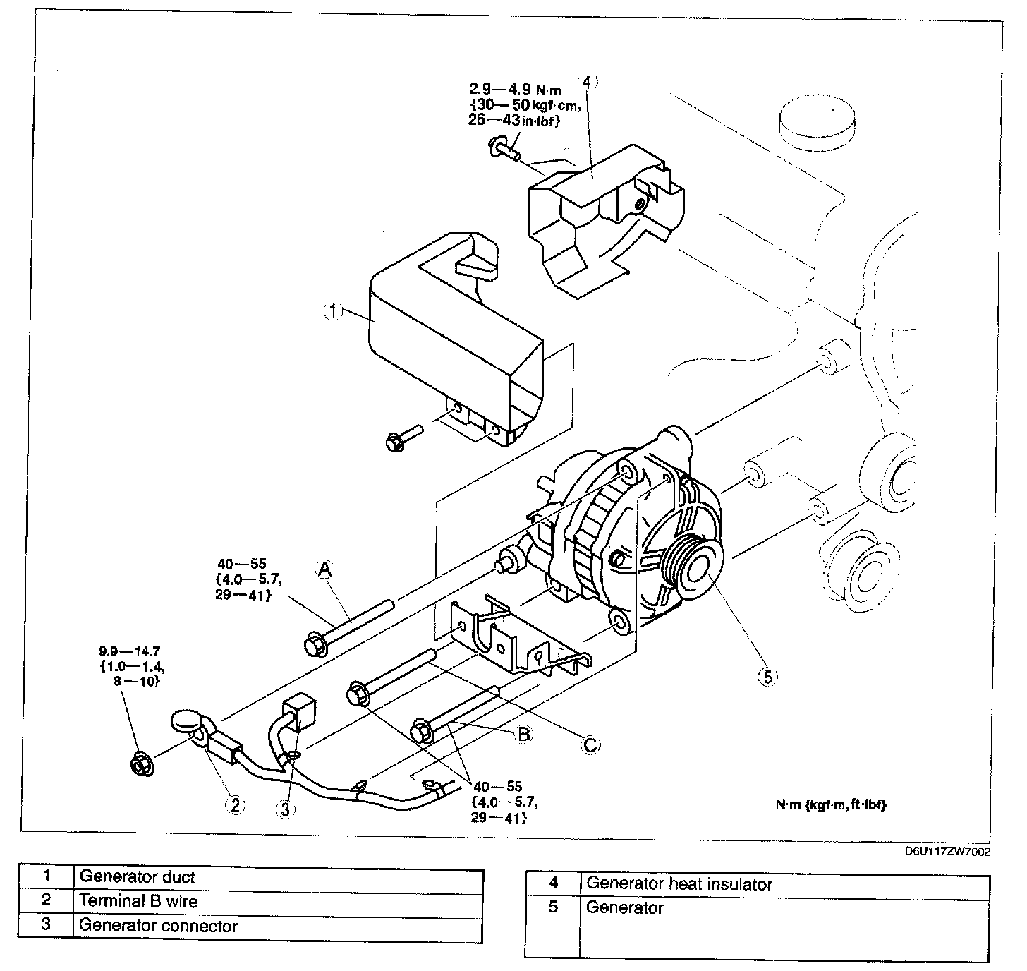 WARNING: When the battery cables are connected, touching the vehicle body with generator terminal B generates sparks. This can cause personal injury, fire, and damage to the electrical components. Always disconnect the battery before performing the following operation.