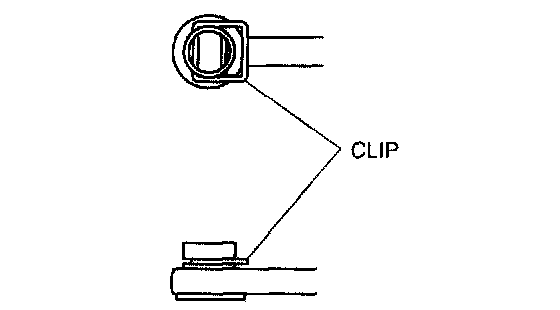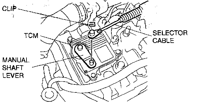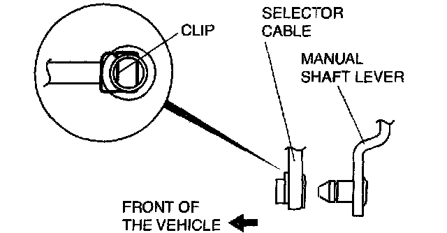 ^ Install the selector lever to the manual shaft lever with the clip side of the selector cable end facing the front of the vehicle.