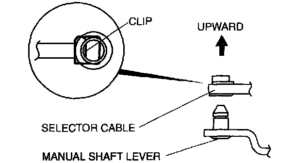 ^ Install the selector lever to the manual shaft lever with the clip side of the selector cable end facing up.