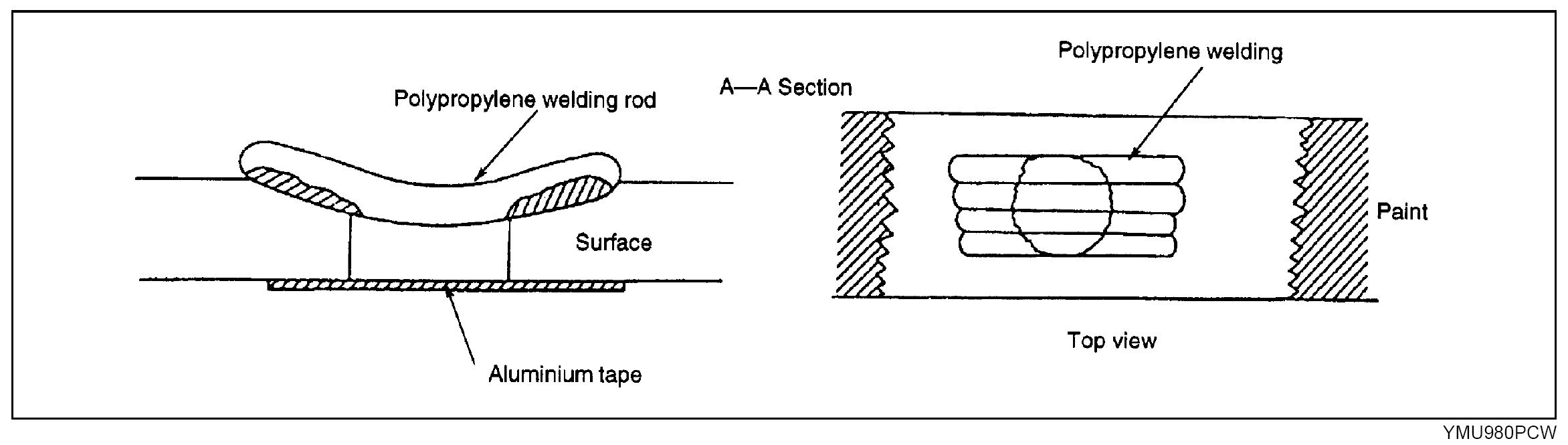 - For repair of a hole, degrease the area on both sides of the bumper and apply aluminium tape on the reverse side of the damage area.