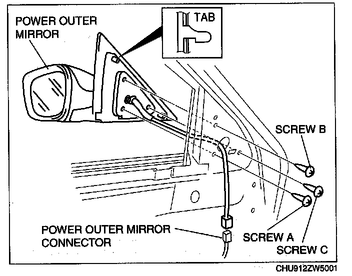 8. Push the power outer mirror against the vehicle and detach the tab while lifting the mirror up to remove.