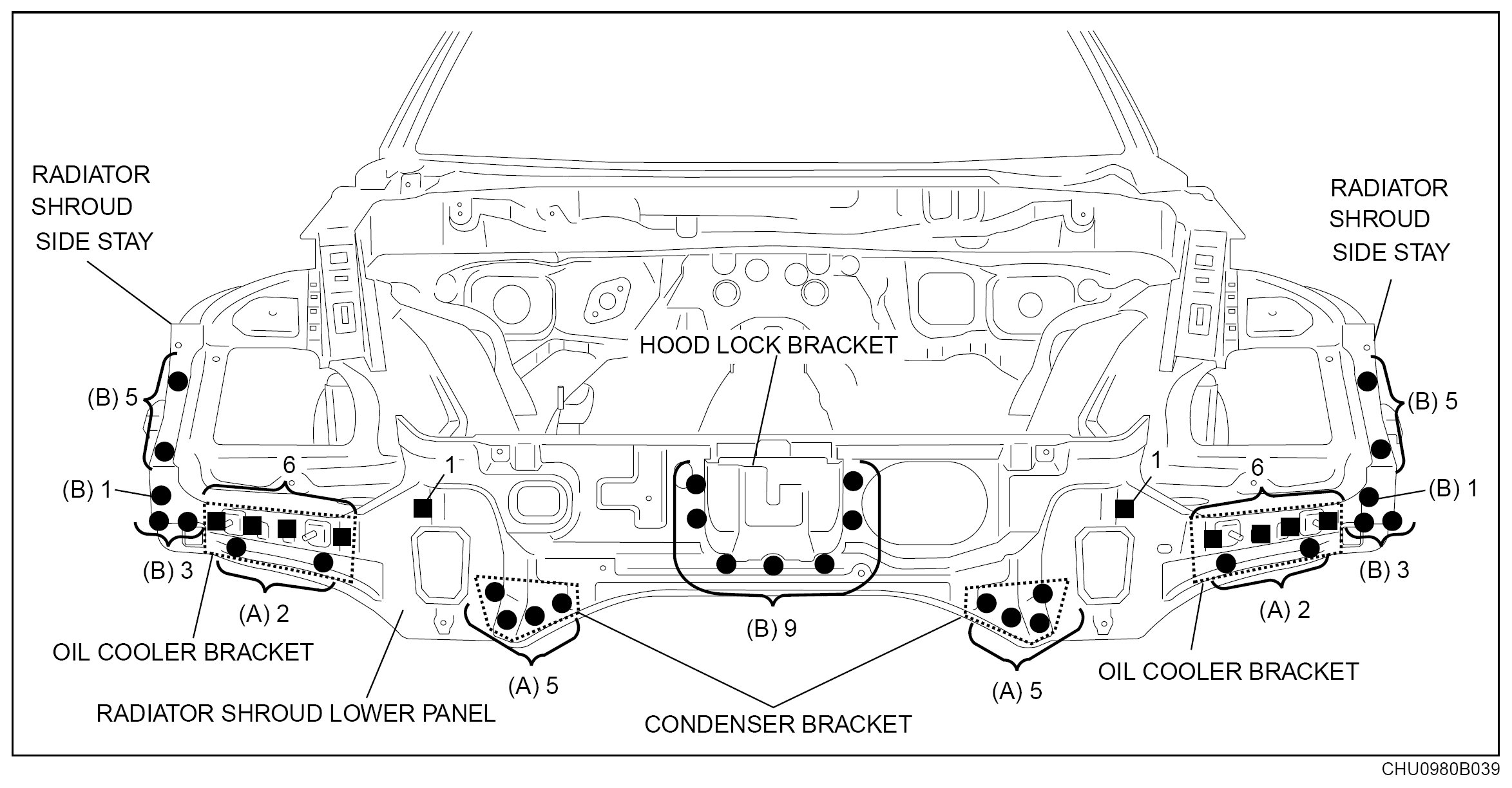 NOTE: When replacing the radiator shroud side stay and the hood lock bracket separately, weld the 27 locations indicated by (B).