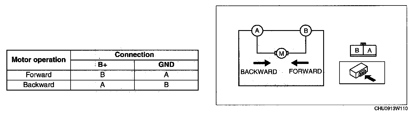 2. Connect battery positive voltage to slide motor terminal A or B, then verity that the slide motor operate as shown in the table.
