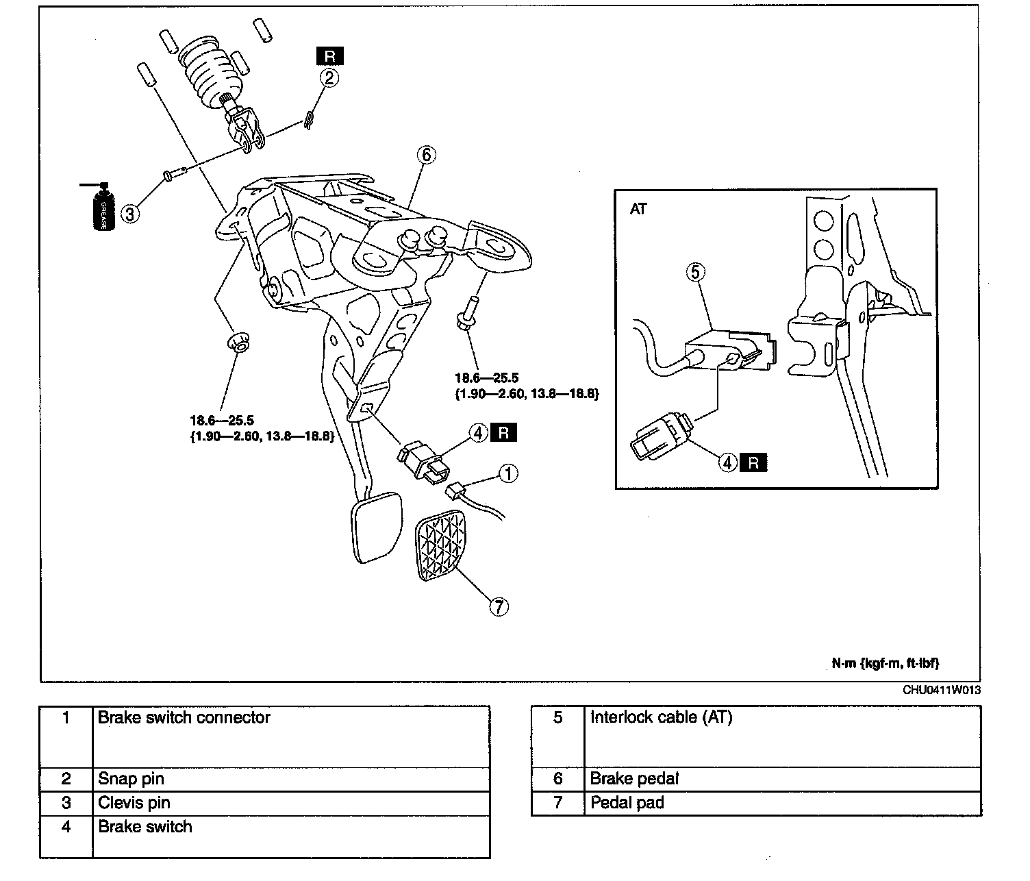 ^ When replacing the brake pedal (AT), it is possible that the installation of the interlock cable could become defective. Always refer to the interlock cable installation note when replacing the brake pedal.
