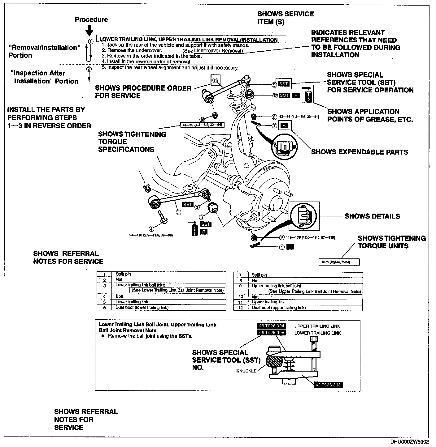 2. Expendable parts, tightening torques, and symbols for oil, grease, and sealant are shown in the overview illustration. In addition, symbols indicating parts requiring the use of special service tools or equivalent are also shown.