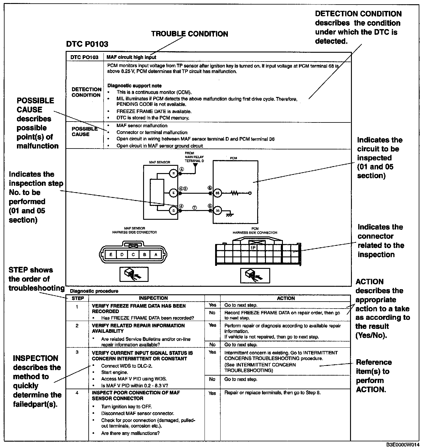 - DTC troubleshooting flow shows diagnostic procedures, inspection methods, and proper action to take for each DTC.