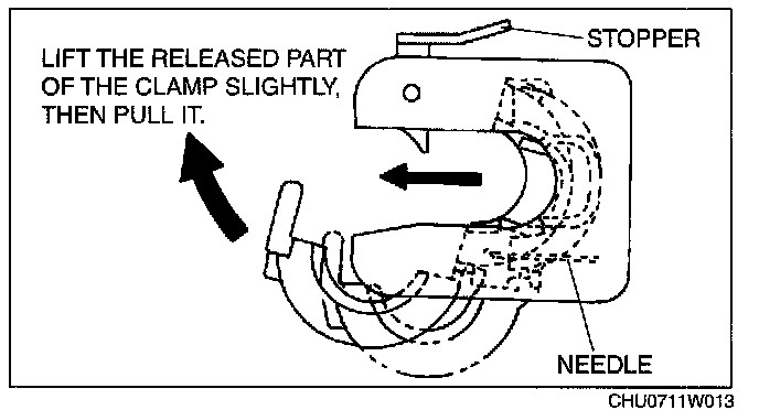 CAUTION: Be careful not to bend the SST (49 N061 OAO) needle when removing the clamp. If the SST (49 N061 OAO) needle is bent, the clamp can not be opened.