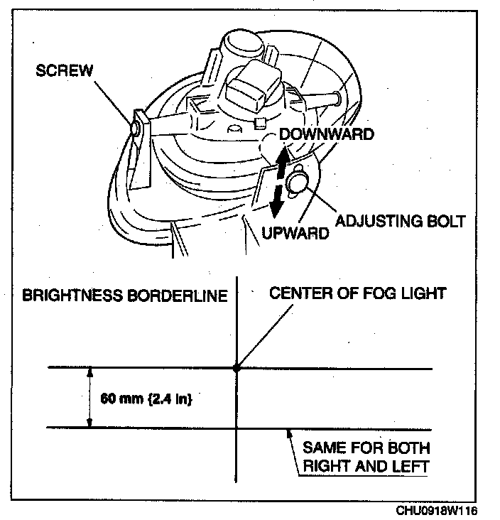 9. Loosen the screw and the adjusting bolt, move the front fog light in the direction of the arrows, and adjust the front fog light beam to the position shown in the figure.