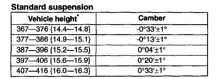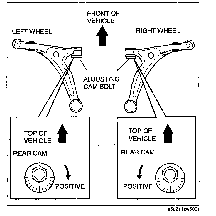 ^ The camber and caster change largely if the front cam is adjusted due to the suspension construction. If the rear cam is adjusted, the caster largely, however, the camber barely changes. Therefore, adjust the camber (front cam) and then the caster (rear cam) to adjust the alignment efficiently.