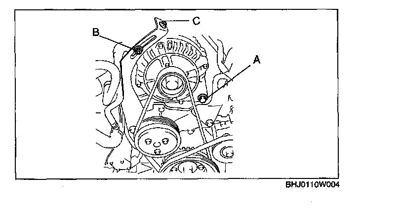 5. Install the drive belt and adjust the drive belt deflection by tightening adjusting bolt C to the specification.