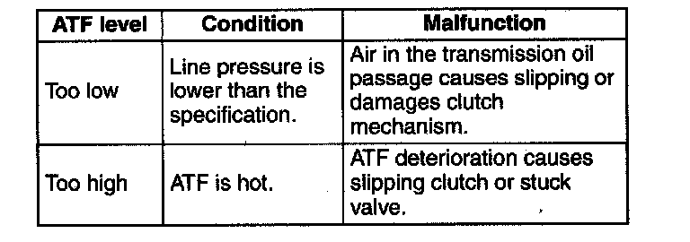 ^ If the ATF level is too high or too low when the engine is hot, the following malfunctions may occur.