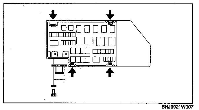 1. Press the tabs in the direction indicated by the arrows, lift the main fuse block, and then remove the bolt.