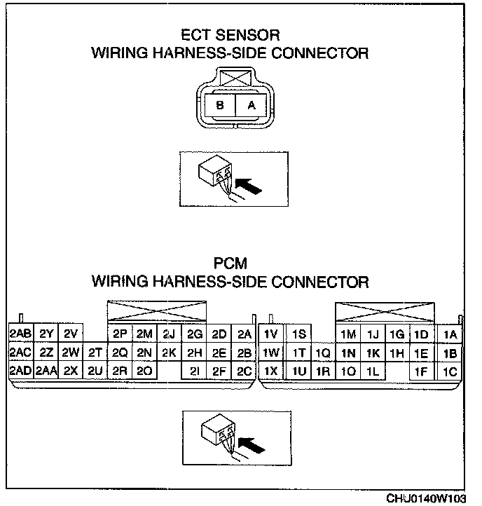 - ECT sensor terminal B and PCM terminal 1U