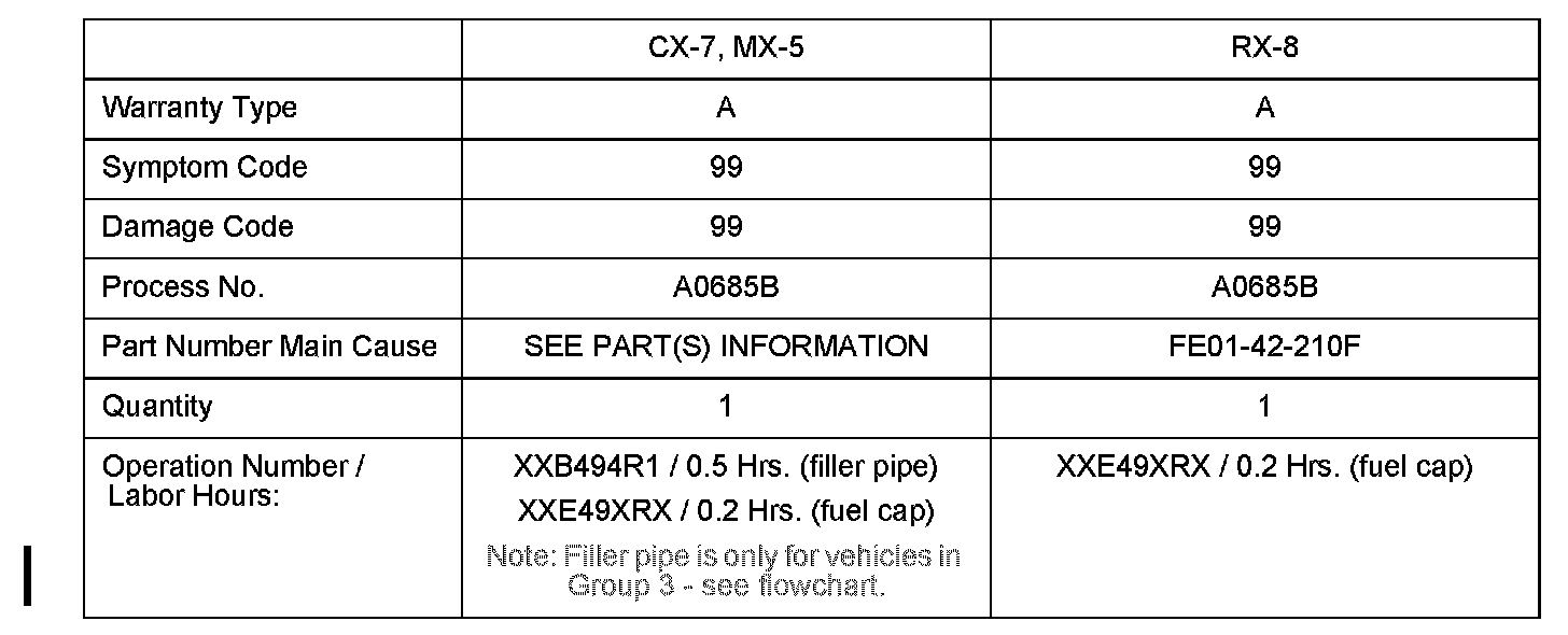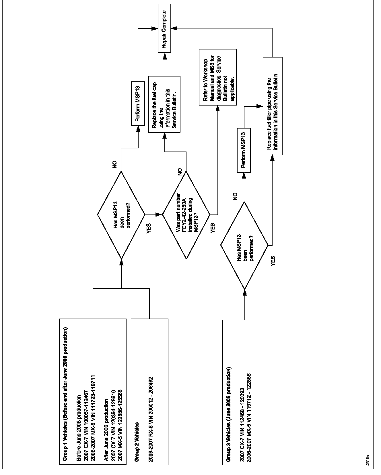 2. Perform MSP13 and/or replace the fuel cap or fuel filler pipe according to the chart. For fuel filler pipe, refer to MS3 online instructions or Workshop Manual section 01-14 FUEL TANK REMOVAL / INSTALLATION.