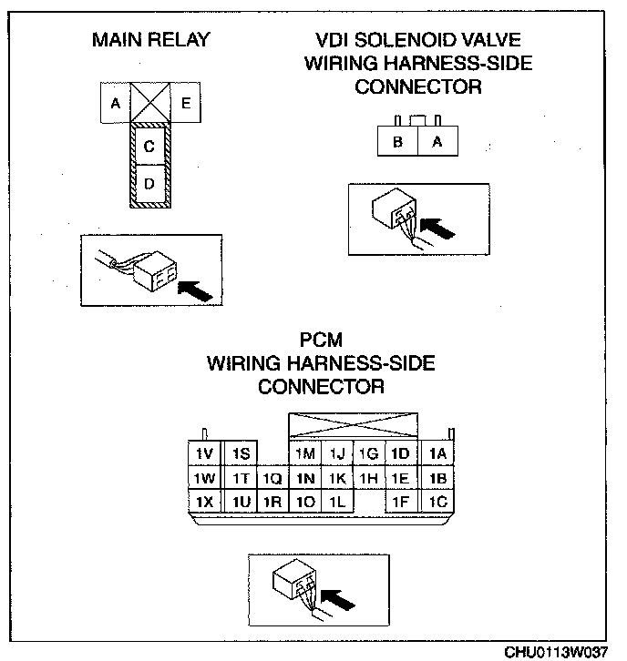 - VDI solenoid valve terminal A (harness-side) and main relay terminal C (harness-side)