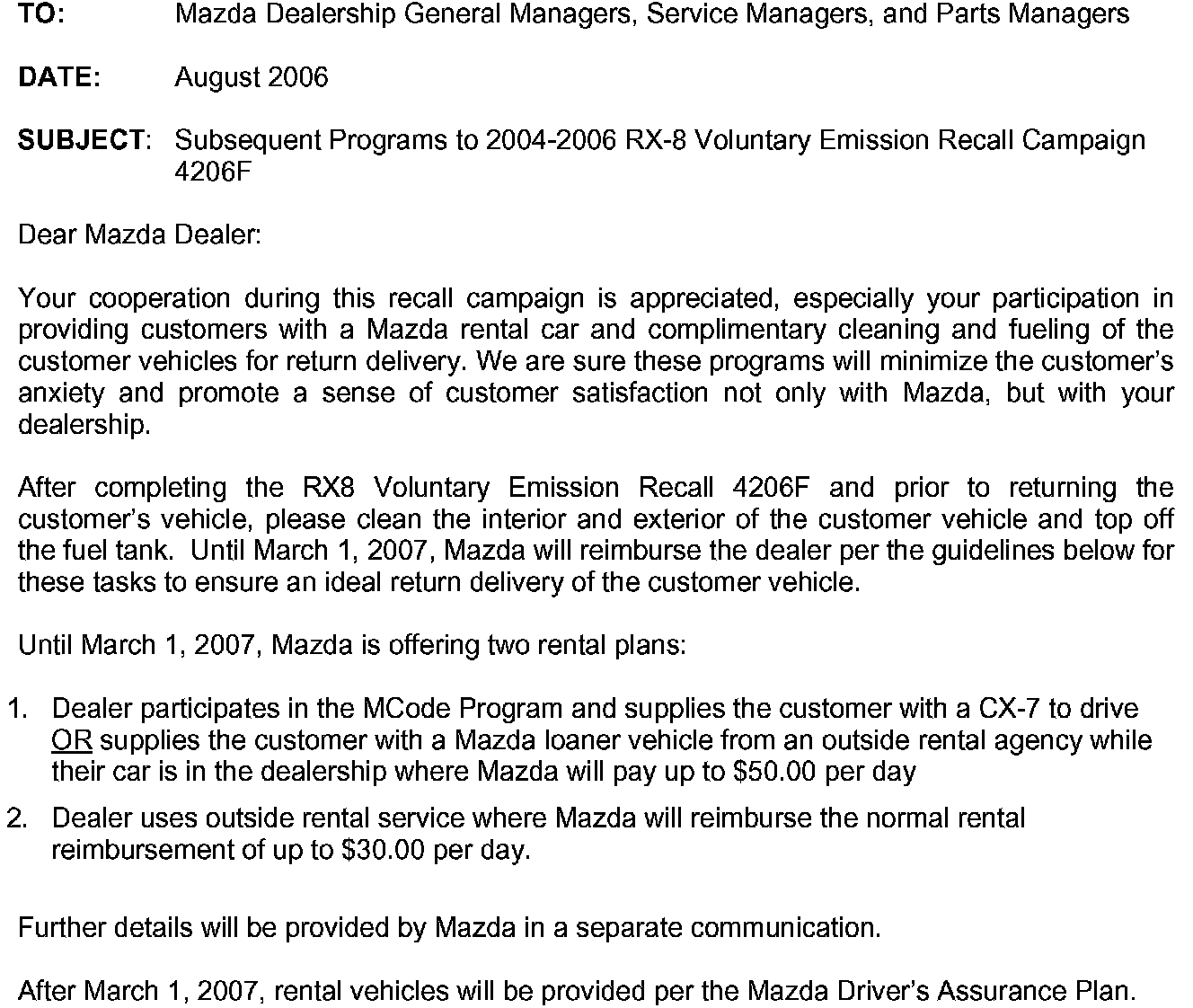Dealer Letter - Subsequent Programs to 2004-2006 RX-8 Recall