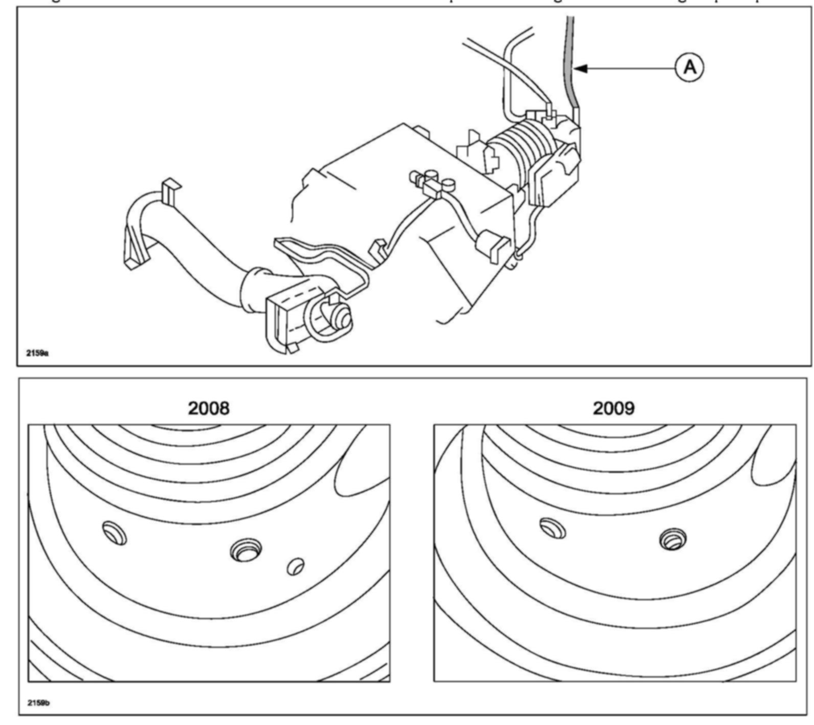 Some vehicles may experience high oil consumption if the air intake hose was replaced with service parts. The cause of this is the number of ventilation holes on the hose was changed from three (3) to two (2) for 2009. However, it appears that the service part hose for 2009 was shipped for 2004-2008 RX-8 by mistake since January 8, 2008. If the hose for a 2009 model is installed on a 2004-2008 RX-8, the barometric pressure, which is normally applied on a small hose (A) connected to the metering oil nozzle is plugged. Engine vacuum then goes to the metering oil nozzle instead so that oil is supplied inside the engine is more than the Metering Oil Pump (MOP) injects, resulting in high oil consumption.