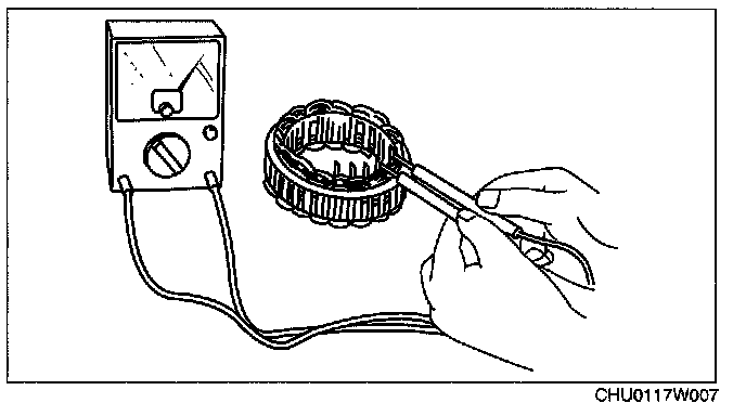 2. Verity that there is no continuity between the stator coil leads and the core using a tester.