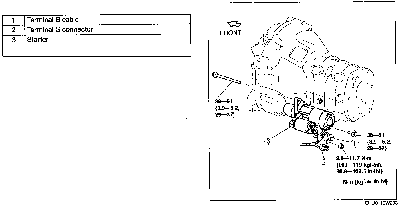 - When the battery cables are connected, touching the vehicle body with starter terminal B will generate sparks. This can cause personal injury, fire, and damage to the electrical components. Always disconnect the negative battery cable before performing the following operation.